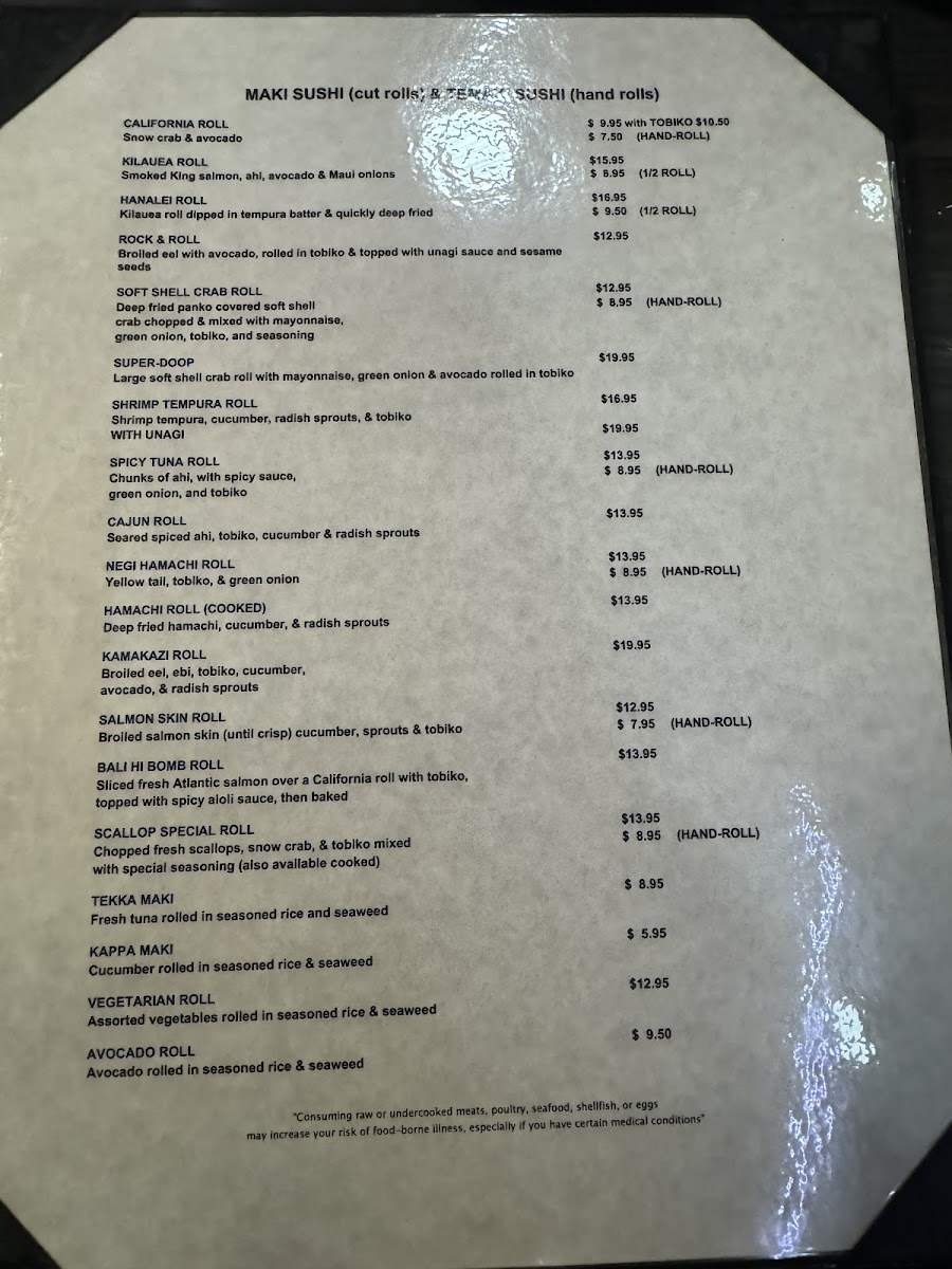 If sushi is your calling, you simply cannot miss the Bali Hai Bomb Roll and the Soft Shell Crab Roll, both priced around $12.95 to $19.95. Crafted with precision by skilled sushi chefs, each roll bursts with freshness, elevating your sushi experience to new heights. The fish is so fresh you can taste the ocean, and the presentation is nothing short of artful—a true feast for the eyes and the palate alike.